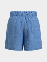 Introducing the Exact blue knit lacey shorts for young fashionistas! Made with a textured knit detail fabric, featuring side pockets and a comfy elasticated waist. Perfect for pairing with her favorite tee or the matching shirt for a fun co-ord look we love.