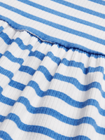 Dress your little one in style with this blue and white striped rib dress. Made with a comfortable rib fabric, featuring ruffle sleeves, gathered wasit and a blue and white striped design. Keep your child looking trendy and feeling comfortable all day long.