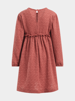 Keep your little one looking stylish in this mocha brown textured dress. It features a unique design that stands out, with a ruffle detail on the waist and a beautiful textured fabric. This dress is a must-have for any stylish princess.