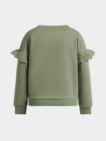 Stay cozy in this fatigue sweat top from Exact. Crafted from brushed fleece for ultimate comfort. Featuring a cute anglaise trim detail, ribbed crew neck, sleeve cuffs and hem. Pair with jeans and sneakers for a casual look. Perfect for everyday wear.