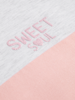 Get cozy in our grey, white and pink colourblock graphic sweat top. Made from brushed fleece for ultimate comfort. This sweat top goes perfect with the matching joggers and some sneakers. Perfect for everyday wear.