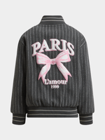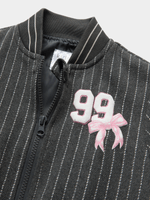 Bundle up your little one in style with our grey pinstripe bomber jacket from Exact! Made from melton fabric, this bomber features a back and front graphic print, pinstripe design, zip up, and ribbed cuffs, hem and neck. Perfect for any casual outing.