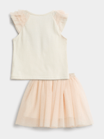 Prepare your little one for a special occasion with this adorable party set. This set features a top with a gold sequin heart and mesh ruffle sleeves, and a mesh skirt with an elasticated waist. Perfect for young fashionistas who love to sparkle!