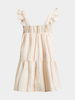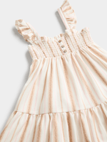 Keep your little one stylish in our natural and brown striped dress! Made from linen blend fabric, featuring a smocked bodice with buttons, and ruffled straps, this dress is perfect for any adventure.
