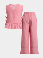 Dress your little one in style with this adorable pink bow top and pants set. Made from textured seersucker fabric, this set features a peplum design top with side bow detailing and matching pants in a comfortable fit. The perfect set for playdates or outings.