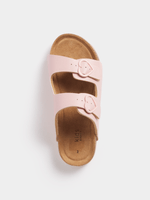 Step up your little one's shoe game with these adorable pink double-strap sandals. Featuring adjustable straps with heart buckles and moulded cork foot beds. These sandals are comfortable and stylish, perfect for everyday wear.