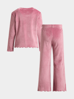 Keep your little one snuggled up in style with our Exact girl's pink rib fleece sleepwear set. This set features a ribbed long sleeve top with ruffle cuffs, and elasticated waist pants with ruffle hems. Perfect for lounging or snoozing.