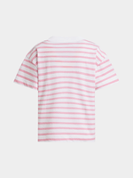 Dress your little one in a trendy style with this pink and white striped t-shirt. Made from 100% cotton single jersey fabric for all-day comfort. Features a crew neck, short sleeves, and a fun graphic print. Perfect for mixing and matching with our bottoms for a unique look.