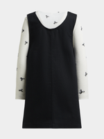 Dress your little one in style with our Exact girl's white and black pinafore and t-shirt set. Made from twill fabric, this set features a ribbed long sleeve top with a bow print, and pinafore dress with front pockets. Perfect for any fun-filled day!