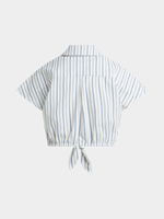 Elevate your little one's wardrobe with our white and blue striped front tie shirt. Made from soft and breathable linen blend fabric, featuring a front tie detailing and button up, this shirt is perfect for all-day comfort. Mix and match with her favorite bottoms or the matching shorts for a stylish look.