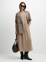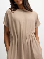 Get ready to turn heads in this Exact beige cinched waist dress. This dress features a cinched waist detail, side pockets, and a midi length. Dress it up with a pair of heels for a night out or down with a pair of sandals for a more casual look.