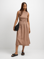 Look effortlessly chic in this Exact beige combo dress from Exact. Made with a combo ribbed top and 100% cotton poplin skirt, featuring side pockets and a midi length. Feel fabulous and confident in this versatile style essential.