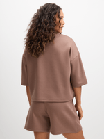 Elevate your casual wardrobe with our Exact cropped scuba boxy top. Made with a soft touch fabric, this top features a flattering cropped boxy silhouette, crew neck and short sleeves. Pair it with the matching shorts.