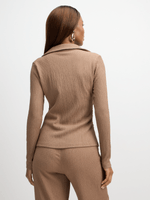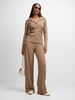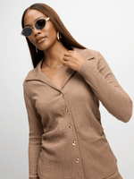 Stay stylish in our beige textured top from Exact! Made from textured fabric, this top features button-through design, long sleeves, gold front buttons and v-neck with collar. Pair with the matching bottoms for a fashionable look.