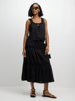 Elevate your style with our Exact black anglaise tiered skirt. Made in delicate anglaise fabric, this skirt has a flattering tiered design and an elastiacted waist for a easy fit. Pair it with your favorite top or the matching cami top for a stylish look.
