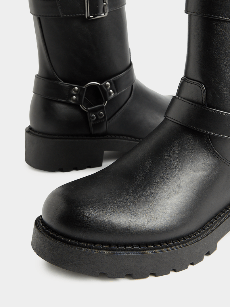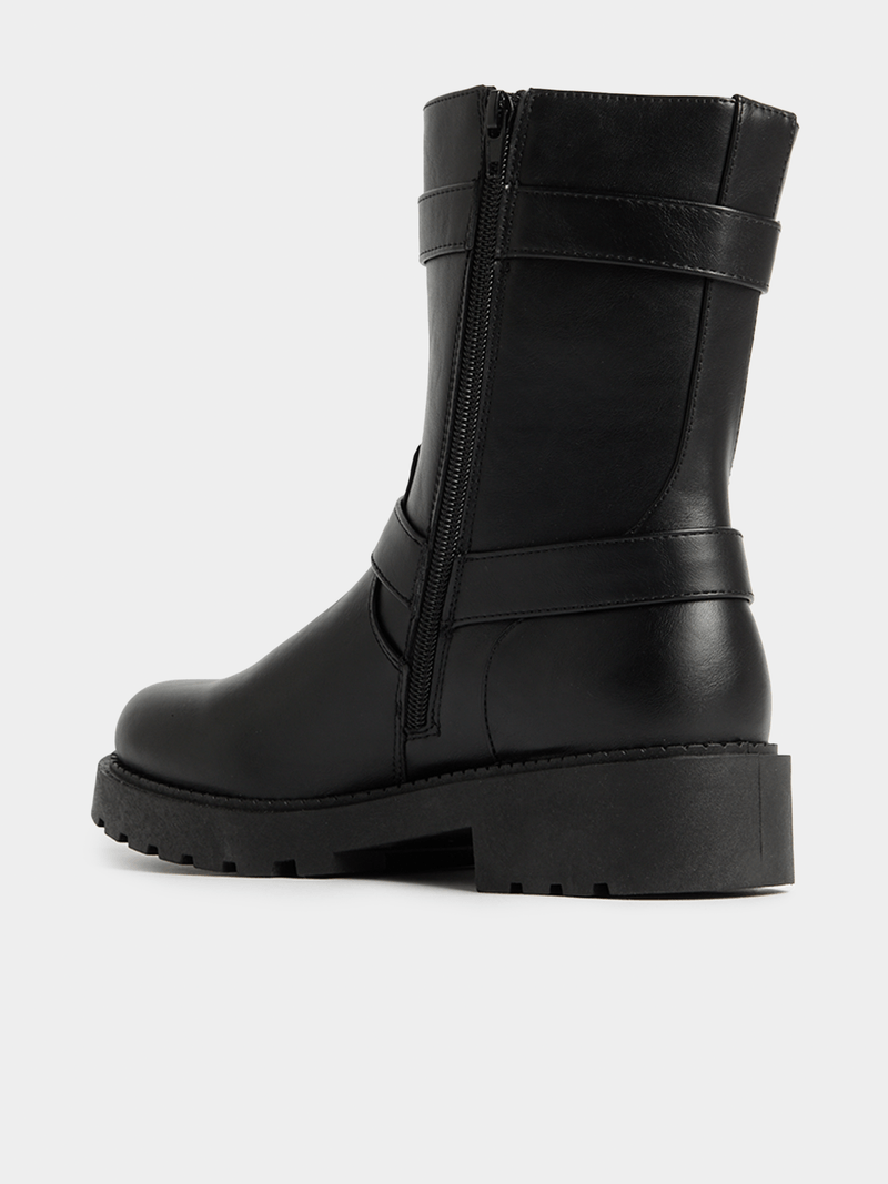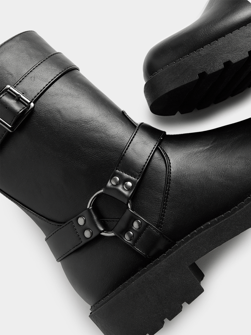 Step up your style game with these Exact biker boots. These black boots feature a biker design, side zip closure, and a sleek trim that adds a touch of edge to any outfit.