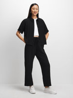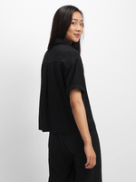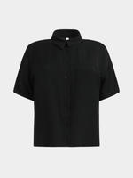 Step out in effortless style with our black boxy shirt. Made from a comfortable rayon blend, this versatile top boasts a relaxed fit that can be styled in multiple ways. Featuring a button-up front and short sleeves, it's the perfect addition to your wardrobe.