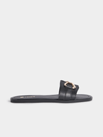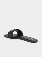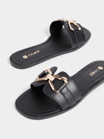 Step out in style with these sleek black sandals from Exact. Featuring a chic metal gold buckle and easy slip-on style, these sandals are a versatile addition to your wardrobe. Pair with dresses, shorts or skirts to step out in confidence this Summer.