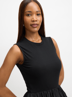 Look effortlessly chic in this Exact black combo dress from Exact. Made with a combo ribbed top and 100% cotton poplin skirt, featuring side pockets and a midi length. Feel fabulous and confident in this versatile style essential.