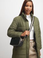 Elevate your style with our double crossbody bag. Perfect for any outfit, it features a sleek black and neutral colour theme, double zips, an adjustable webbing strap, and chic gold metal details. Stay fashionable and organized on the go.