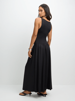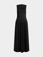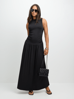 Introducing our sleek black drop waist dress from Exact! This dress features a dropped waist design, high neckline, maxi length, and ruching details. Perfect for any occasion, this dress is a must-have addition to your wardrobe.
