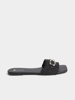 Step into style with our black frayed edge mule sandals. These sandals feature a trendy silver trim detail for a chic look. The colour pairs well with all your fave Summer outfits.
