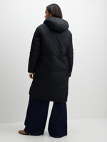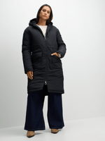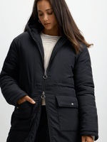 Stay snug and stylish in our black crinkle puffer jacket from Exact! This jacket features a cozy hood, longer length, 2-way zip closure, front pockets, and elasticated waist. Whether you're running errands or out on the town, this jacket will keep you looking chic and feeling comfortable.