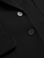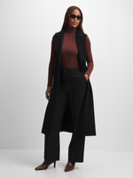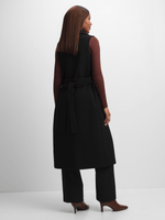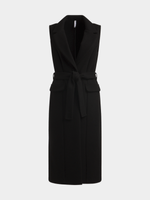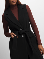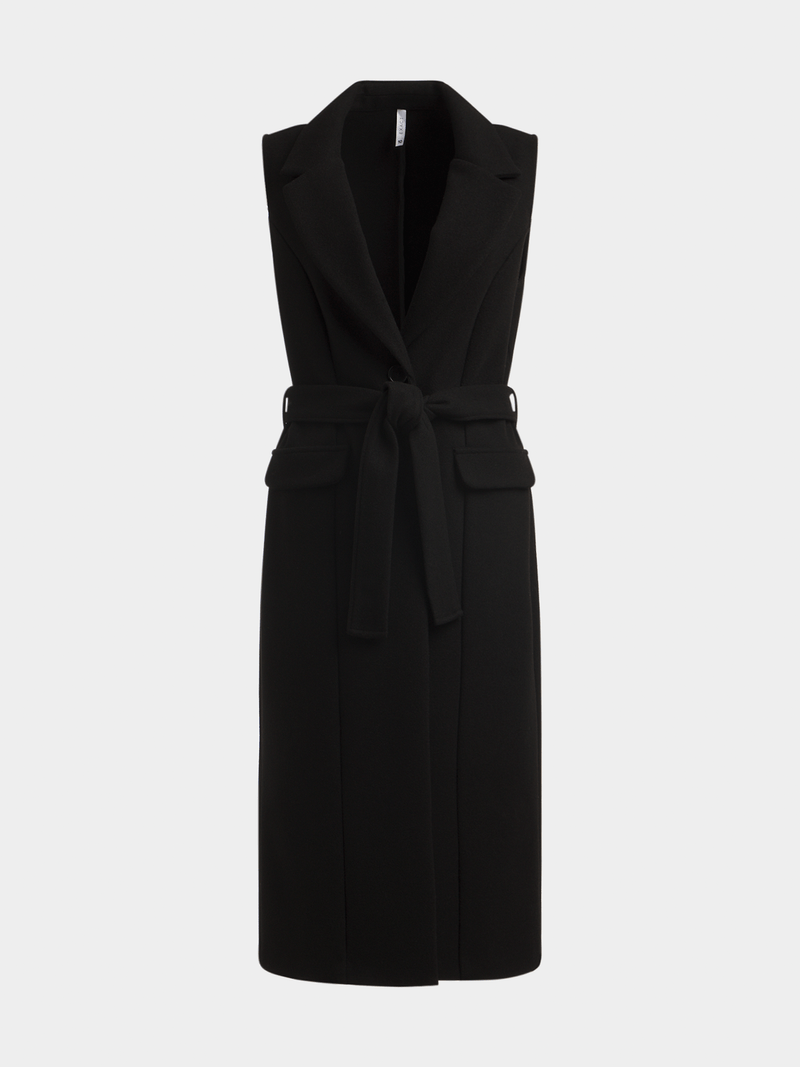 Elevate your style with our black melton waistcoat. Featuring a longer length, tie belt, button up, and sleeveless design, this versatile piece adds a touch of sophistication to any outfit. Perfect for layering and adding a chic look to any outfit.