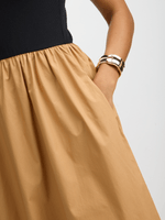 Look effortlessly chic in this Exact black and natural combo dress from Exact. Made with a combo ribbed top and 100% cotton poplin skirt, featuring side pockets and a midi length. Feel fabulous and confident in this versatile style essential.