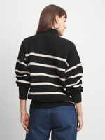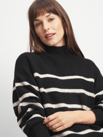 Stay cozy in style with this black & natural striped high neck jersey. Perfect for any occasion, from running errands to relaxing at home.