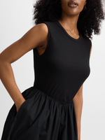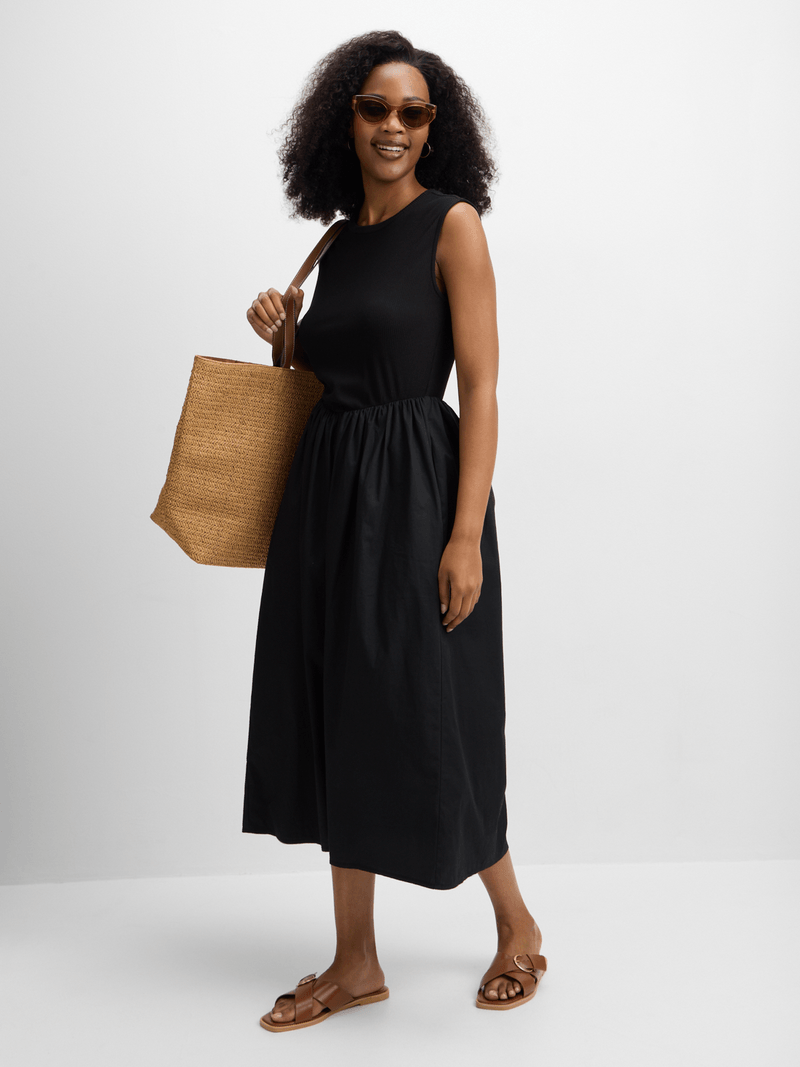 Get ready to stun in this Exact dress! Made with a combo of cotton poplin and rib fabric, featuring side pockets and a midaxi length. Feel fabulous and confident in this versatile piece.
