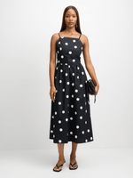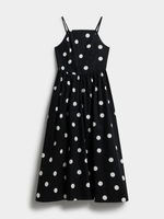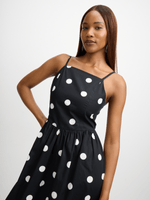 Get ready for Summer with our chic white and black polka dot sundress. Made from a rayon blend fabric, this dress features a stylish tie back detail for the perfect fit. Perfect for sunny days paired with sandals or a night out in heels.