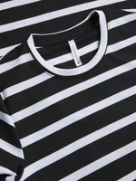 Elevate your style with our black & white rib midi t-shirt dress. Featuring ribbed fabric in a trendy striped design, and a midi length, this dress is perfect for any occasion. Pair with heels for a dressy look or sneakers for a more casual vibe.