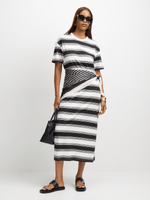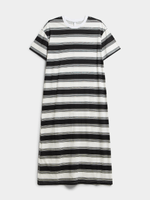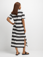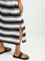 Enjoy the comfort and style of this black and white striped maxi t-shirt dress from Exact. Made from single jersey cotton, this dress features a relaxed fit with a round neckline and short sleeves. Perfect for casual days, this dress can be styled up or down.