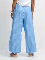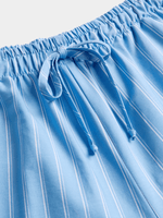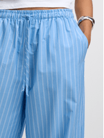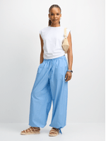 Introducing our blue striped poplin harem pants! Made from cotton poplin fabric, featuring an elasticated waist with drawstring, drawstring cuffs, side pockets and a flattering harem fit. Look chic and trendy effortlessly with these versatile pants