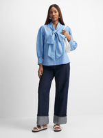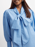 Introducing our versatile blue and white striped blouse, made from cotton poplin fabric, featuring a large statement kitty bow and trendy striped design. Pair it with your favorite bottoms for a complete look.
