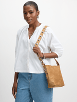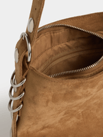 Elevate your style with our brown bucket crossbody bag. This bag features a bucket design, an adjustable strap with studded details and a faux suede look. The bag perfect for carrying all your essentials while adding a touch of style to any outfit.