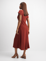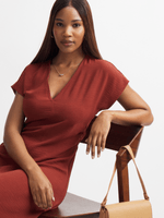 Look effortlessly chic in our brown ruched midi dress! This dress features a beautiful v-neck, ruched sides and a back zip for esy fit. Dress it up with heels or down with sandals for a more casual look.