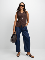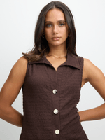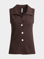 Elevate your look with our brown long textured waistcoat from Exact. Made from a comfortable textured fabric, this waistcoat features a longer length design, gold front buttons and v-neck with collar. Mix and match with your favorite pieces for a chic ensemble.