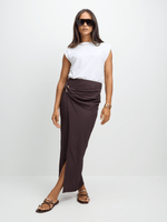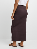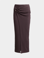 Elevate your wardrobe with our chocolate brown textured skirt. Featuring a chic wrap tube design with metal gold trim and an elasticated waist. Dress it up with heels or down with sandals and pair with the matching waistcoat. This is a must-have skirt for the season!