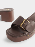 Step out in style with our Exact women's brown wooden heels featuring gold buckles and stud details. These heels offer a comfortable fit and a trendy block heel. Perfect for everyday wear, these mules are a versatile addition to your wardrobe.