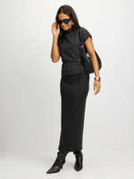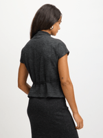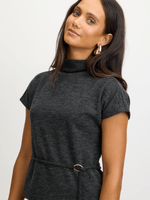 Introducing our Exact choarcoal front tie top. Made from unbrushed fabric, this top features a chic turtle neck design with a tie belt. Perfect for pairing with your favorite bottoms or the matching skirt.