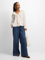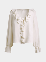 Elevate your look with our cream ruffle blouse. Designed with flutter sleeves, a chic neck tie and front ruffles for added flair. Versatile and perfect for any occasion, this blouse is a must-have staple in your closet.