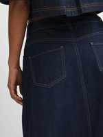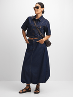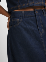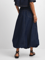 Introducing our new denim bubble skirt. This skirt features a unique bubble hem shape, maxi length, trendy dark raw wash and a classic 5-pocket design. Pair it your favorite top or the matching jacket or waistcoat.