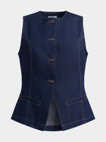 Introducing our dark raw wash long denim waistcoat, perfect for adding a touch of edge to any outfit. Made from cotton denim fabric, this waistcoat featuring a high neck, button up and a longer length for a chic look. Pair it with our matching denim skirt or jeans for an effortlessly stylish vibe.