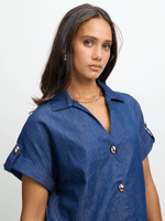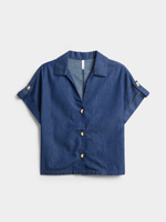 Stay effortlessly stylish in this dark wash boxy shirt from Exact. Made from 100% cotton chambray fabric, this shirt features a boxy fit, chic gold butons and a v-neck design. Pair it with your favorite bottoms for a casual chic look.