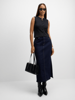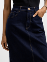 Elevate your style with our dark wash longer length denim skirt. Made from cotton denim stretch fabric for a comfortable fit. Features side slits for a trendy touch, and convenient front and back pockets. Perfect for creating versatile and chic looks.