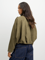 Stay on trend and stylish in our Exact bubble bomber jacket. Made from soft suede-like fabric, this jacket features a trendy funnel neck and bubble design, and gold button up closure. Pair with your favorite bottoms for a chic look.