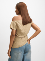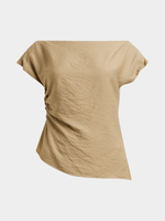 Elevate your style with our Exact draped top in a chic fatigue hue. Made from rayon blend fabric, this versatile top features a flattering draped design, ruched side, and asymmetrical hem. Perfect for any occasion, simply pair with your favorite bottoms for a chic look.