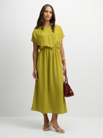 Get ready to turn heads in this Exact green cinched waist dress. This dress features a cinched waist detail, side pockets, and a midi length. Dress it up with a pair of heels for a night out or down with a pair of sandals for a more casual look.